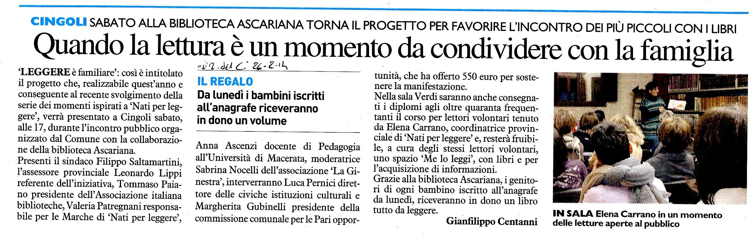 Nell’occasione, alla presenza di esperti del settore, sarà presentato il progetto Nati per Leggere e le iniziative programmate a Cingoli per il 2014.